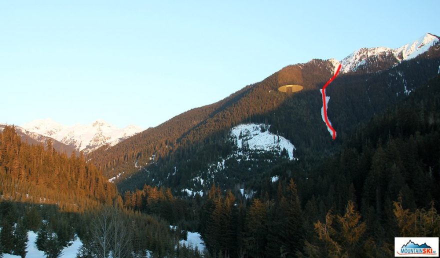 Pohled z CMH Galena lodge na náš sjezd – značený červeně, výstup byl vlevo nejprve pasekou, výše hustým lesem a ještě více přímo průsekem