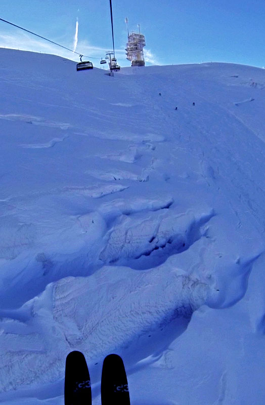 Titlis – Nejaký ten prašan po oboch stranách sedačky Ice Flyer na malý Titlis