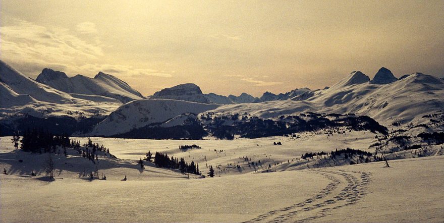 Výhled z SSV přes zasněžené Sunshine meadows až k Mt. Assiniboine