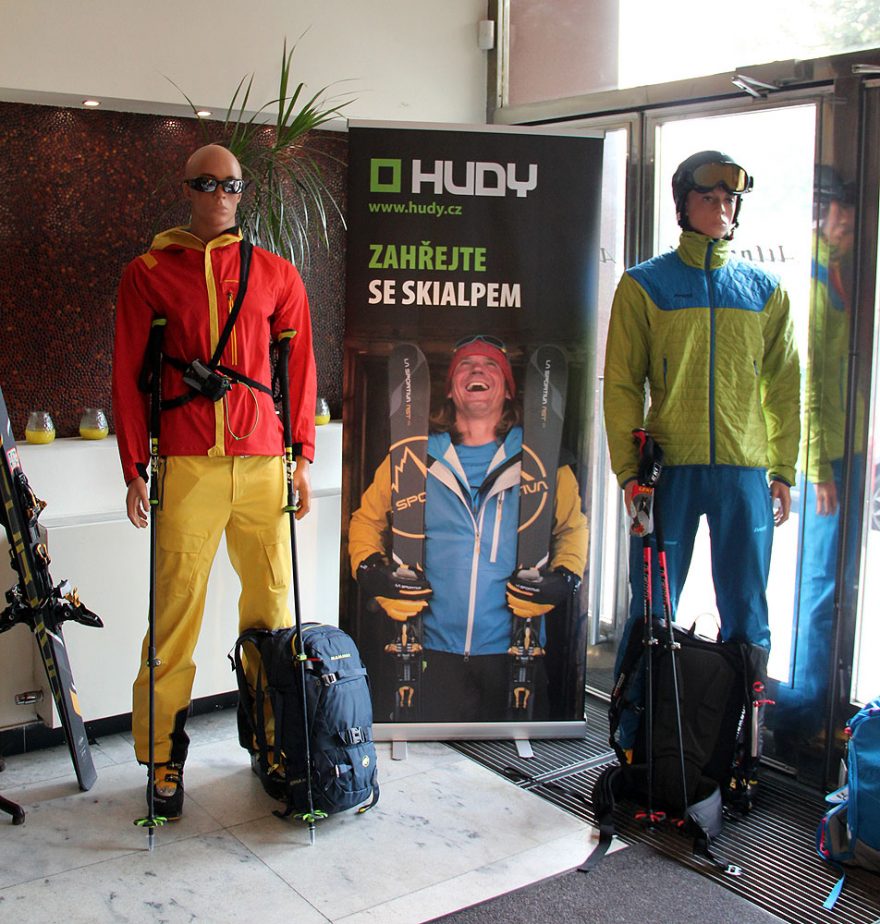 Ve vestibulu kina Atlas bylo několik kompletních skialpinistických výbav