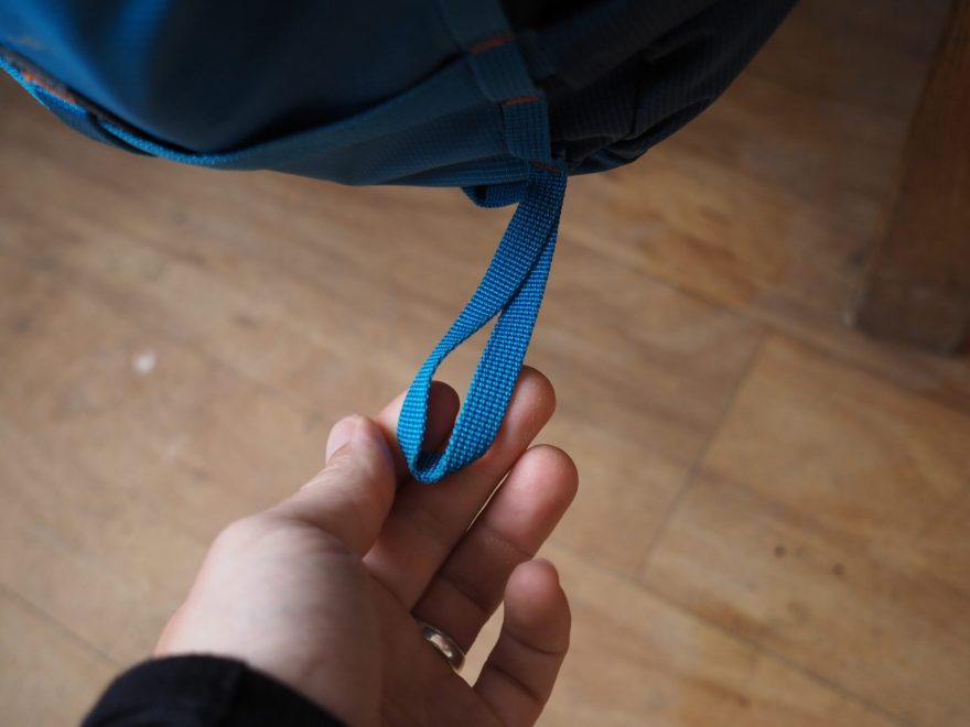 Detail smyčky pro uchycení cepínu nebo trekové hole. Ridge je vybaven dvěmi poutky.