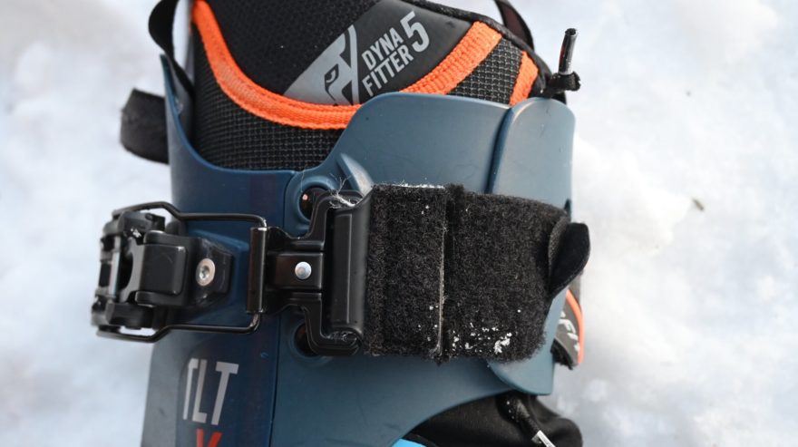 O stažení nohy v komíně bot Dynafit TLT X se stará takto široký pásek s regulací obvodu pomocí suchého zipu