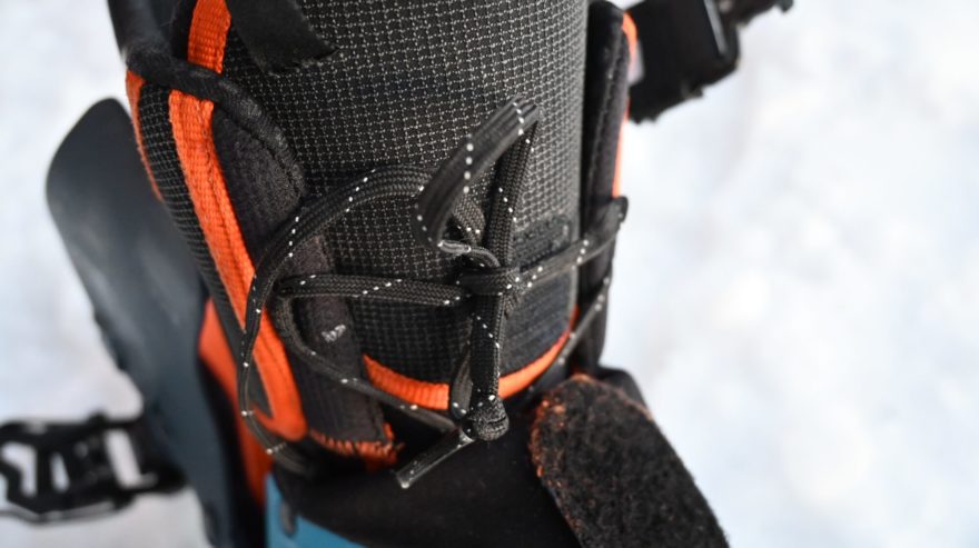 Při zatažení tkaniček pod návlek, dochází k jejím poškození suchým zipem na jazyku bot Dynafit TLT X