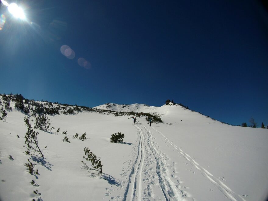 Skialpinismus v Rakousku s protisvětlem v levém horním okraji snímku -opět výrazná vinětace