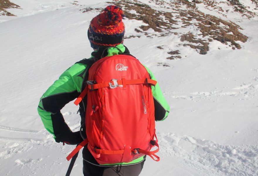 Celkový pohled na Lowe Alpine Descent 35 s povoleným spodním popruhem po diagonálním nesení lyží