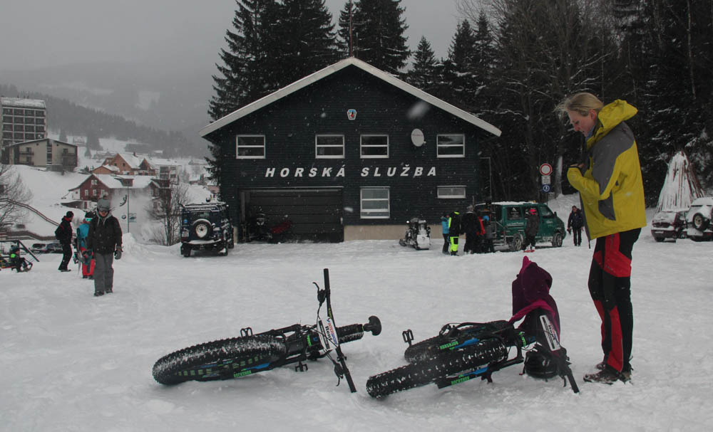 S fatbiky na pláni před budovou Horské služby v Peci pod Sněžkou