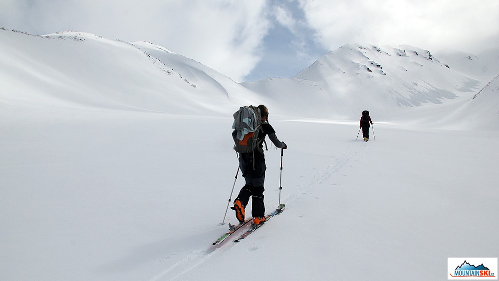 Marta a za ní v závěsu Katka vedou stopu ke splazům a lavinám v dolní části výstupu na Viljučinskij
