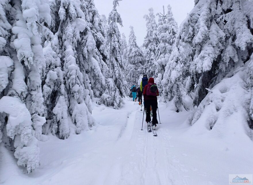 Stoupání lesem mezi stromy zasypanými sněhem