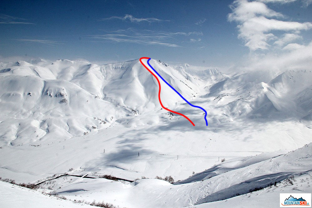 Pik Roman pří pohledu z protilhlého vrcholu, červeně naše výstupová stopa, modře sjezd
