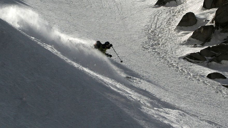 Sjezd strmým žlabem v oblasti Alam Kooh v Íránu, sníh létá jak může