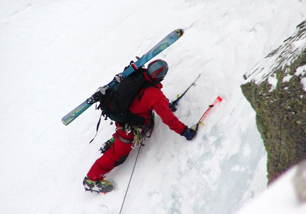 Lyže na batohu diagonálně při kombinovaném ledovo-sněhovém výstupu ve Vysokých Tatrách