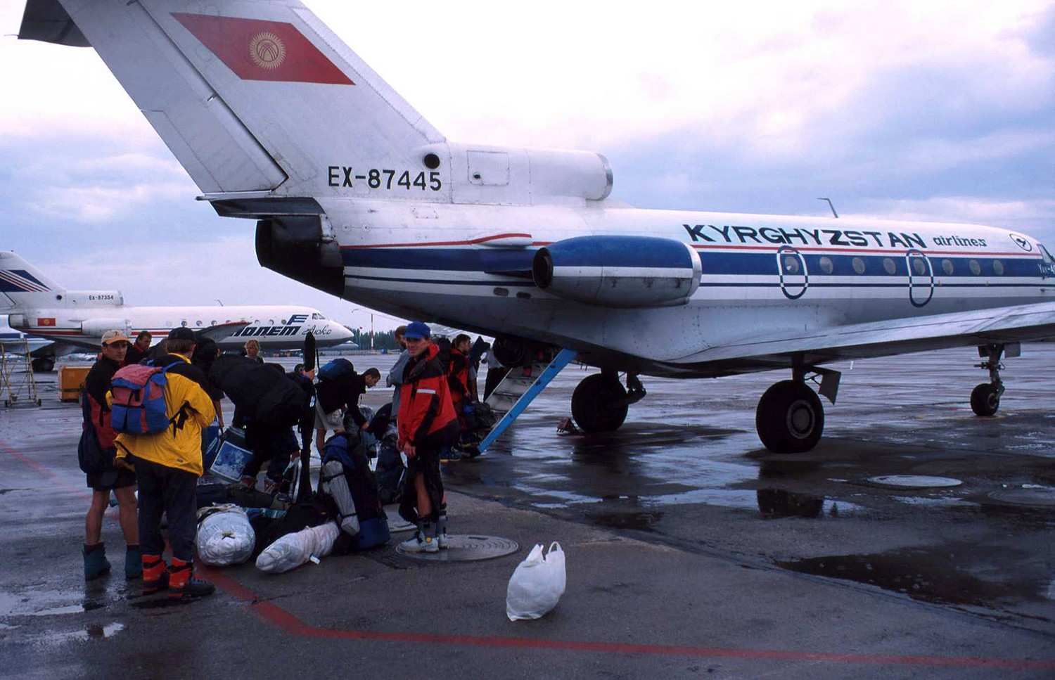 Nástup do místní linky Biškek - Oš v Kyrgyzstánu, se skialpovým vybavením je to trochu oříšek