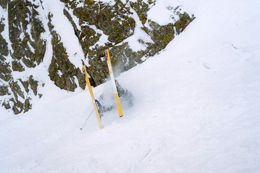 Perfektní provedení pádu ve žlabu, kdy došlo pomocí kotoulu nebo salta (v prašanu to nebylo poznat) k přetočení lyžaře zpátky na lyže
