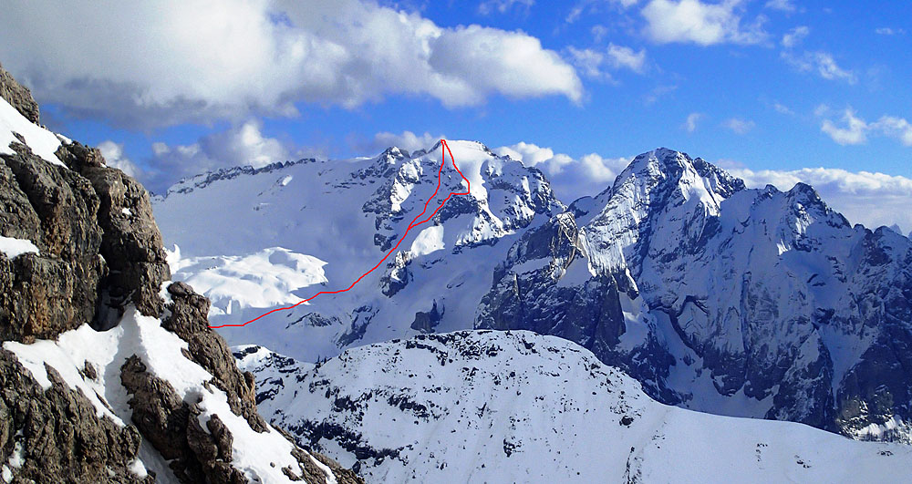 Nákres zjazdu – Marmolada (vľavo Ferova línia, vpravo Peťa a Tomáš)