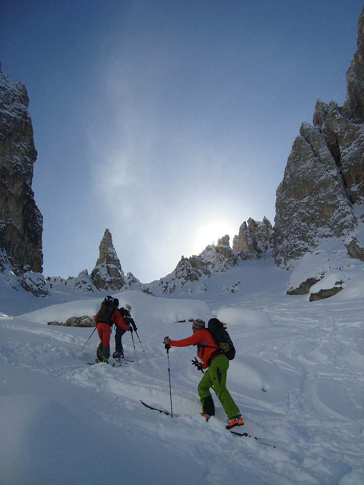 Honza a kouřící komín, výstup do sedla mezi cima Cadin della Neva a cima Cadin di Lucano