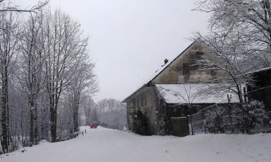 Odjezd od lyžařského areálu Brněnka krásně vysněženou silnicí