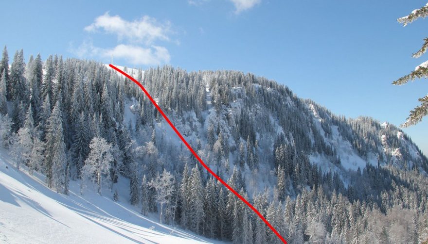 Náhled na sjezdovou linii v lese a u skal