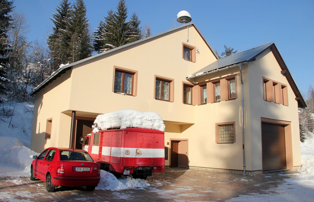 Hasičská zbrojnice v Horní Lomné, sněhu na autě je víc než dost