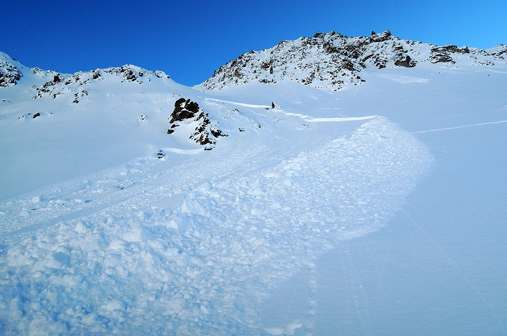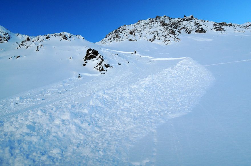 Laviniště vzniklé utržením laviny při výstupu, ABS batoh zůstal v autě