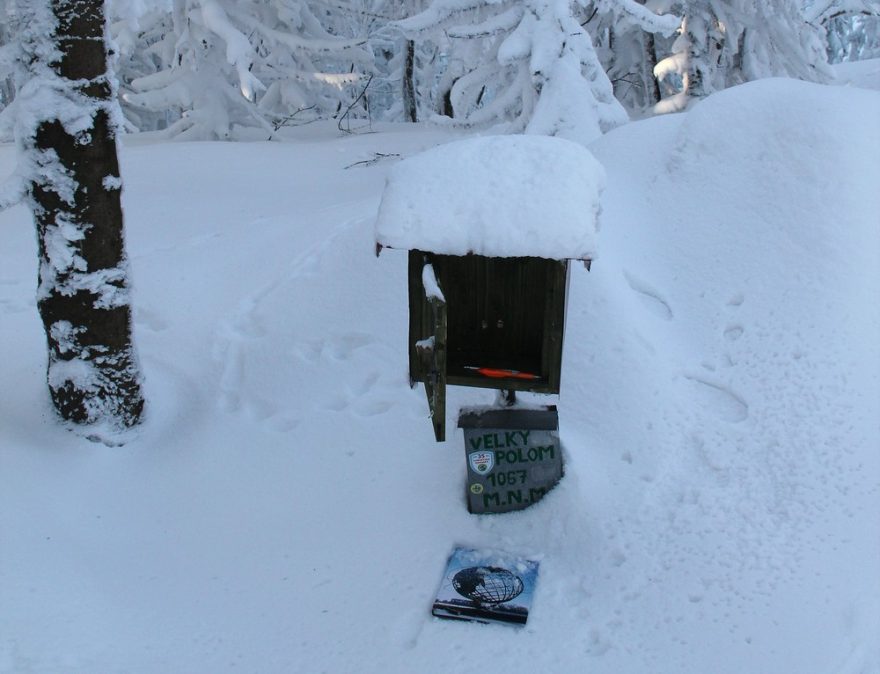Vrcholová kniha na Velkém Polomu ležela na sněhu, dal jsem ji zpátky do krabice