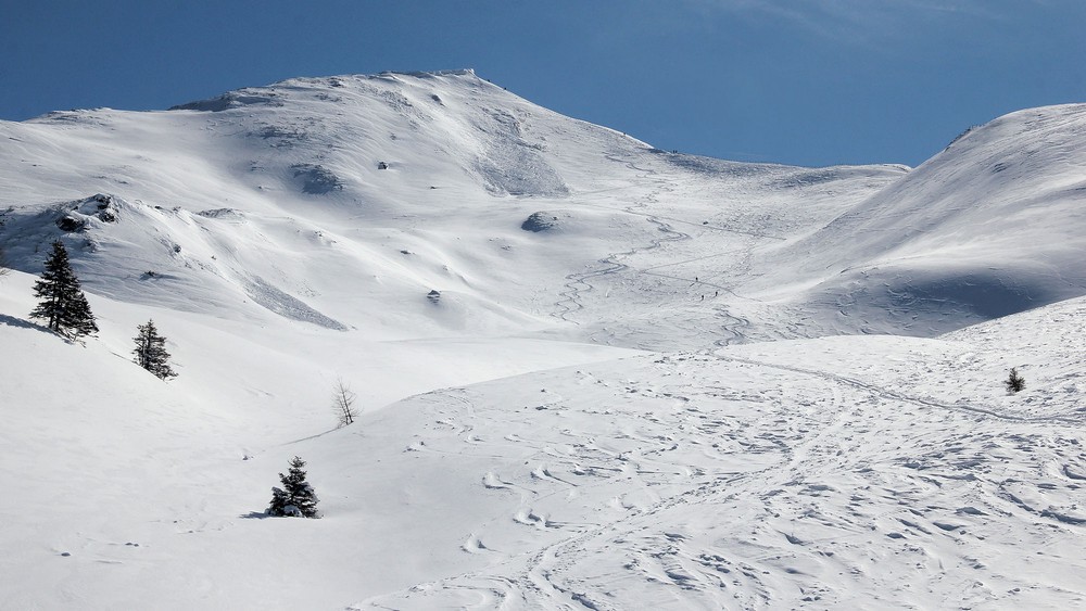 Vrchol Vennspitze je na dohled, stejně jako splazy a laviny