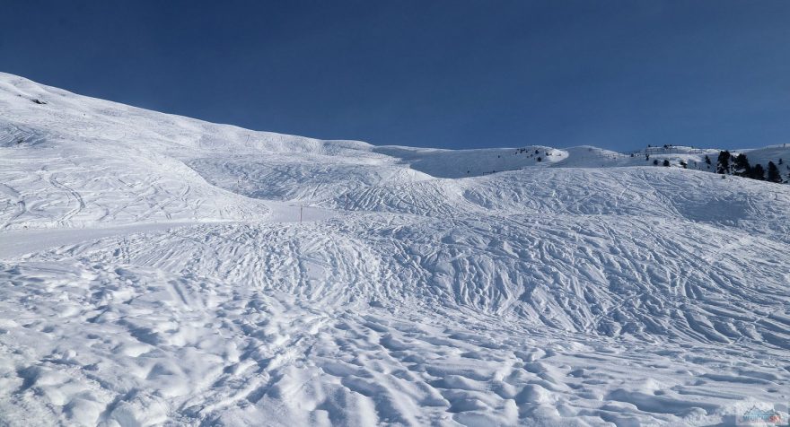Když na Pische dlouho nesněží, vypadá svah takto, upravená je pouze výstupová trasa