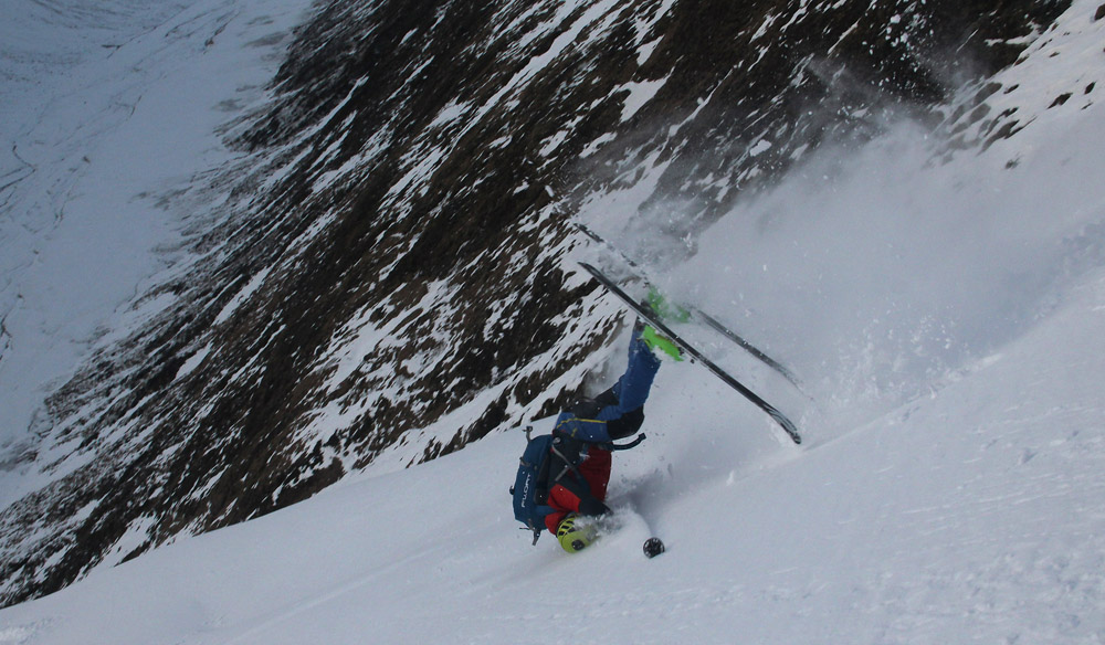 Vojta předvádí dokonale provedenou pádovou techniku přes hlavu s paralelním vedením lyží