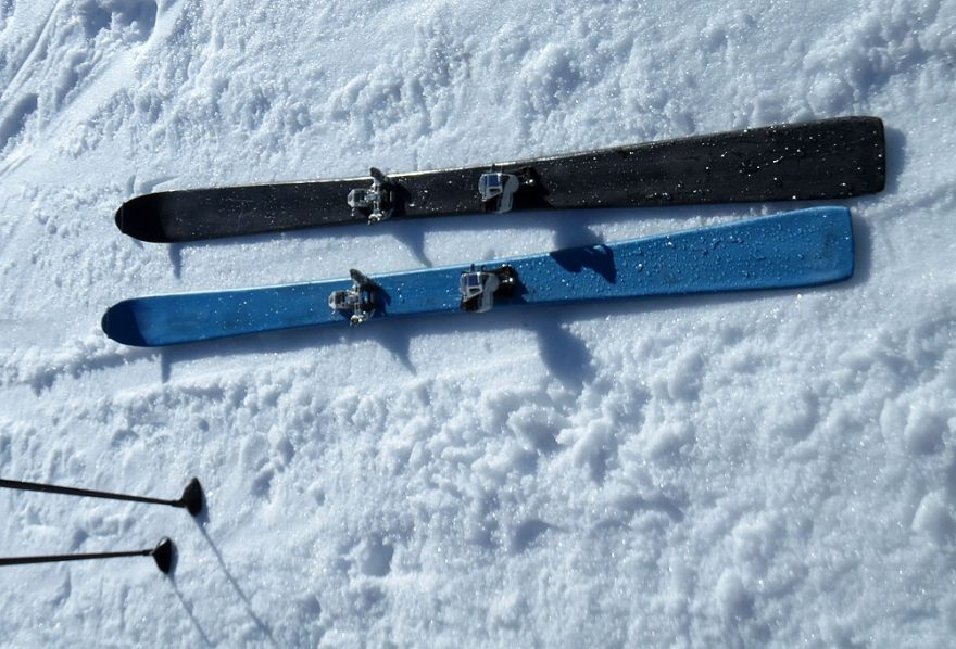 V terénu s prvními lyžemi – černá uhlíková, modrá skelná
