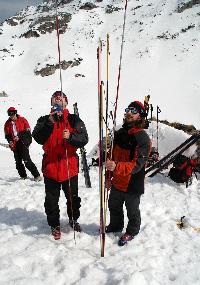 Rozebrat lavinové sondy a nastoupit s nimi k hledání v laviništi