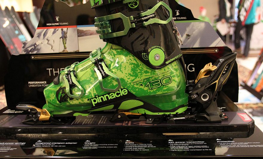 Marker Kingpin, špička je cvaknutá na sjezd, zatímco pata vázání je nastavená na chůzi po rovině, k tomu boty K2 Pinnacle 130