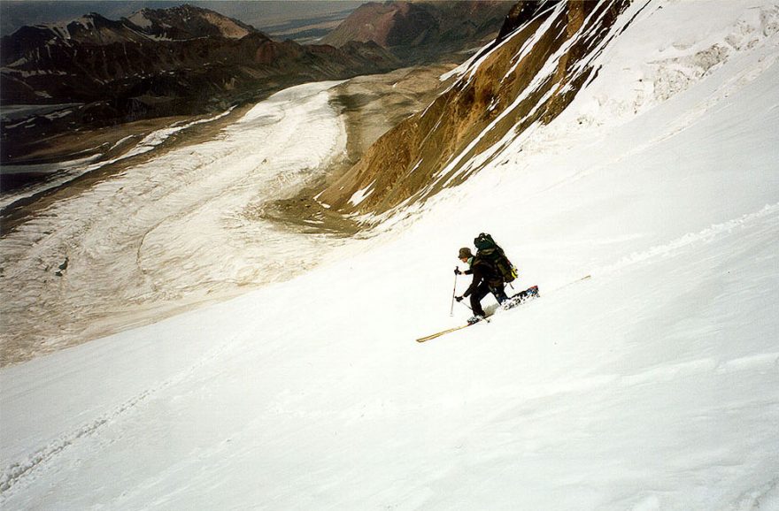 Na telemarkových lyžích s těžkým batohem v dolní části severní stěny Piku Lenina