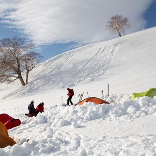 Vypínání stanu byl na silné vrstvě sněhu trochu problém, protože klasické letní stanové kolíky nebyly použitelné a sněhových kotev bylo jenom šest. Sněhové kotvy byly rychle vyčerpány, a proto ke slovu přišly také lyže (4 ks), cepíny (2 ks) a zbytek byl kombinací teleskopických hůlek a nalámaných větví z kamčatské kamenné břízy. Stavbu stanu jsme dokončili vykopáním menší díry u vnitřního stanu v předsíni pro snadnější obouvání skialpinistických skeletů.