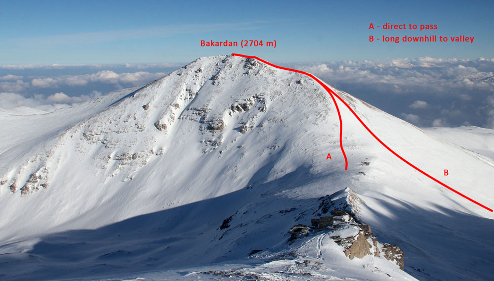 Traverz přes tento vrchol se sjezdem na tuleních pásech do sedla pod Karabunar (cca 2600 m). Strmý výstup je možný na tuleních pásech, pokud je ale sníh hodně tvrdý, tak se hodí cepín a pěší výstup na stoupacích železech. Po přechodu hřebene Karabunaru následuje další sjezd pod druhý nejvyšší vrchol oblasti – 2704 metrů vysoký Bakardan. Výstup na něj je kousek od hrany svahů stmě spadajících směrem na Tetovo. Vrcholový hřeben Bakardanu spadá na severozápad strmým skalnatým svahem, stejně jako na SVV. V ostatních směrech nabízí Bakardan krásné sjezdové možnosti. Ze samotného vrcholu vrcholu Bakardanu jsou parádní kruhové panoramatické výhledy na velkou část Makedonie.
