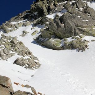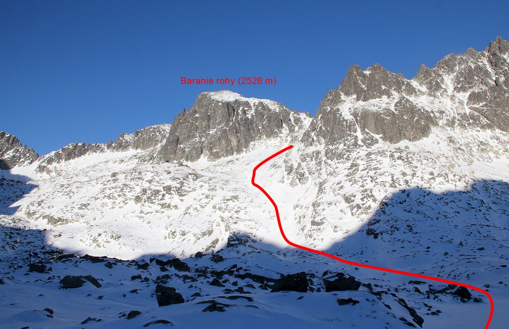 Pod skalami stoupáme strmým svahem traverzy na lyžích (případně na stoupacích železech podle aktuálních podmínek). Držíme se stale v pravé části pod skalami vybíhajícími do Malé Studené doliny ze Spišského štítu. Výše se dostáváme na široký svah, kterým stoupáme stale vzhůru až se dostaneme mezi skalní výběžek po levé straně a skalní stěnu po pravé straně. Pokračujeme posledním úsekem do Baranieho sedla. Podle ročního období a množství sněhu může být závěrečný úsek po celé šíři dokonale vysněžený, ale na druhou stranu se může stat, že sněhu tady bude jen o něco víc než na délku lyží.