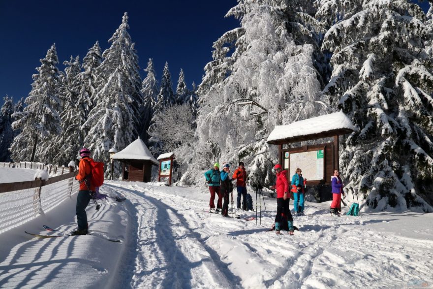 U bývalého lyžařského střediska Solisko není žádné parkoviště, a proto jsem auto nechali na hlavním záchytném parkovišti u vyhlídky. Přešli jsme silnici a nazuli si skialpy. Šlapali jsme vedle silnice v hromadách nového sněhu. Pouze jednou jsme museli silnici přecházet, a jelikož byla posypaná, tak jsme sundali lyže. Ke konci silnice jsme už skialpy sundali, jelikož na silnici byl posyp a mimo ni se v úseku pod bývalým lyžařským střediskem na lyžích jít nedalo.
