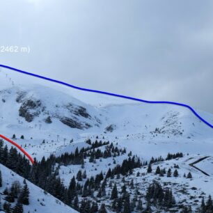 Z vrcholu Antena je velké množství sjezdů na různé světové strany. Zatímco předchozí túra popisovala strmý sjezd podél skalnaté Bobinovy stěny, v tomto případě využijeme mírnější varianty. Na fotce je modře naznačena výstupová trasa na Antenu a červeně nejstrmější sjezd do doliny mezi Antenou a Čeripašinou. Tato oblast je intenzivně využívána pro catski, a proto je vhodné po sněžení si přivstanout, aby svah nebyl rozjěžděn.