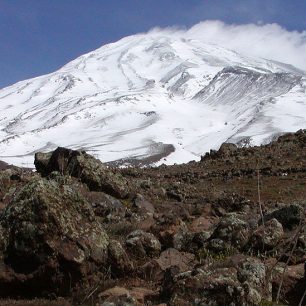 Výhled na Damavand při sjezdu nedalekých čtyřtisícovek