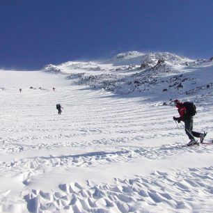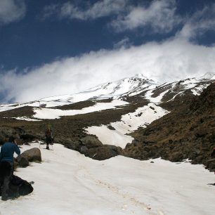 Výstup širokým svahem nad chatou směrem k vrcholu Damavandu