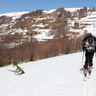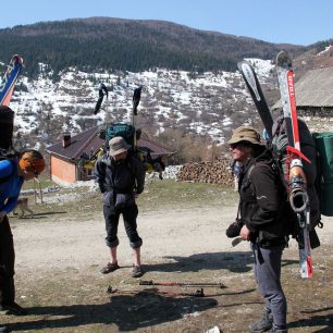 Níže je možné opět vybírat mírnější nebo strmější varianty sjezdu. Posléze kopírujeme výstupovou trasu až na pláně vysoko nad údolími. Po bočním hřebenu se stáčíme k jihu směrem na vybydlenou vesničku Zhuzhinje. Přitom se vyhýbáme vjíždění do potočního koryta a raději se držíme na volných svazích. V jarním období už nad vesničkou nemusí být sníh, a proto do ní docházíme pěšky.