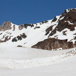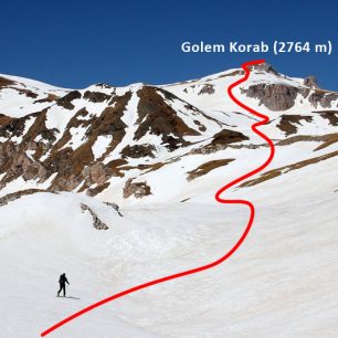 Sjezd mírnějšího vrcholového hřebene Golem Korabu