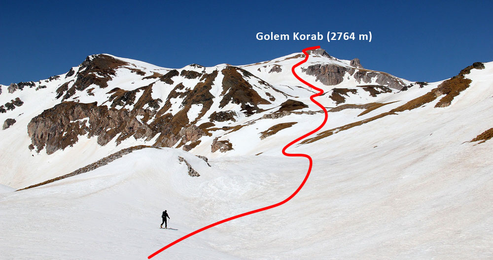 Vrchol 2764 metrů vysokého Golem Korabu se nachází přímo na hranici mezi Makedonií a Albánií. V létě vede z makedonské strany krásná turistická stezka, která není v zimě využitelná kvůli dlouhému traverzu strmějšími jižně orientovanými svahy ve výšce 2300-2350 metrů. Zimní skialpové trasy jsou proto odlišné od letního turistického chodníku.