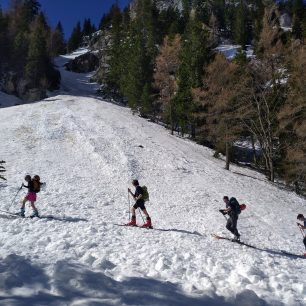 Po zaparkování u malého parkoviště vedle koryta potoka Eisenerzerbach na konci vesnice Hinterwildalpen přecházíme přes potoční koryto a pokračujeme rovně po lesní cestě. Před levotočivou zatáčkou opouštíme silnici a jdeme rovně prudkým potočním korytem po turistické značené stezce 828. Stezka strmě stoupá podél potoka, případně traverzy ve strmějším svahu mimo potok. Sklony okolních svahů přesahují hravě hranici čtyřiceti stupňů.