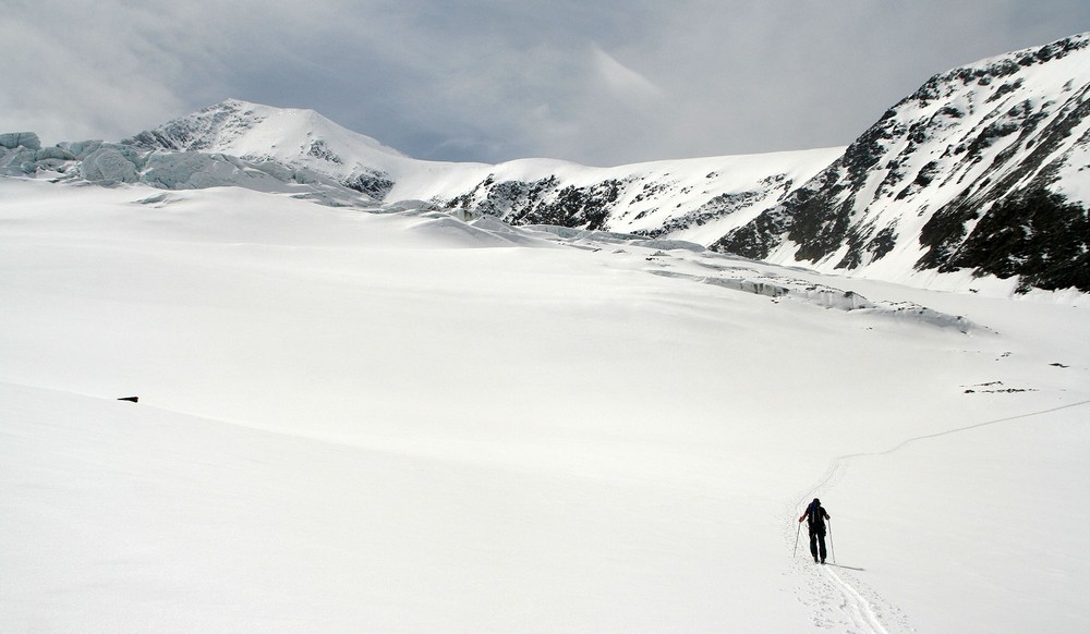 Po pravé straně míjíme Marzellspitze (3500 m) a docházíme na západní svahu z Hintere Schwärze (3628 m). Po celou před sebou dobu vidíme ledovcovou severní stěnu spadající přímo z vrcholu Hintere Schwärze. Tuto stěnu je možné alternativně využít k výstupu na vrchol v případě lezecké výbavy. Klasická skialpová túra vede vpravo od skalnatého “předvrcholu” Hinterez Schwärze po ledovci k hraně stěny (viz zákres ve fotce).