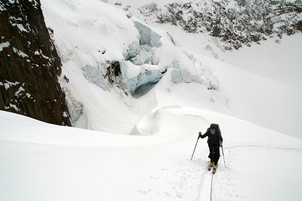 U hrany stěny je v závislosti na aktuálních sněhových podmínkách skidepot, a výše se pokračuje pěšky, případně s využitím stoupacích želez. Závěrečný úsek k vrcholovému kříži může být v kombinaci skála, kamení, led a sníh. Je proto vhodné mít po ruce i stoupací železa a cepín. Bez stoupacích želez se zdál závěrečný svah k vrcholovému kříži poměrně exponovaný s možností krásného volného letu jak na italskou, tak na rakouskou stranu.