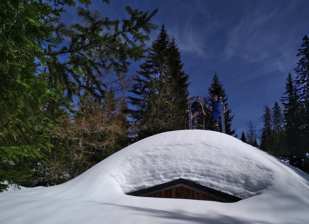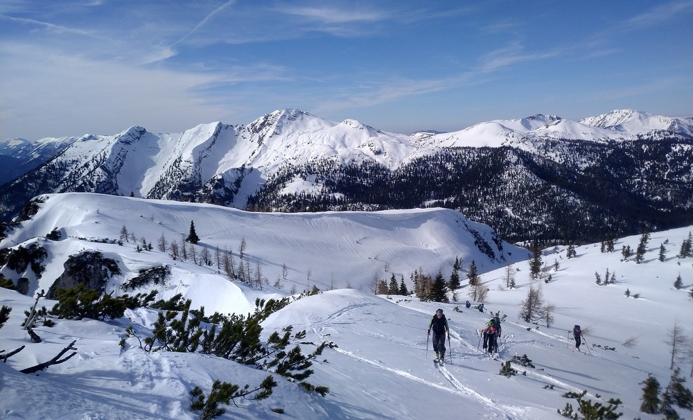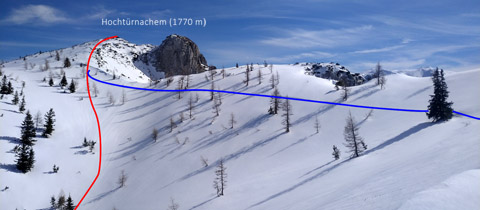 Před sedlem je však třeba odbočit doprava a následovat značení na louku Farnerwiese (1361 m), kde je také chata. Z ní se ubíráme na jihovýchod vzhůru přes Mittelhalt-Nordkamm ke Kammhöhe a dál směrem k vrcholu Hochtürnach s výhledem do údolí potoka Türnseegrabenbach. Pozor na možné velké převěje na hraně do východního údolí ve výšce přibližně 1700 metrů. Závěrečný úsek ke kříži je mírně lezecký, takže s lyžemi zůstáváme na předvrcholu. Na vrchol to jde jenom pěšky.