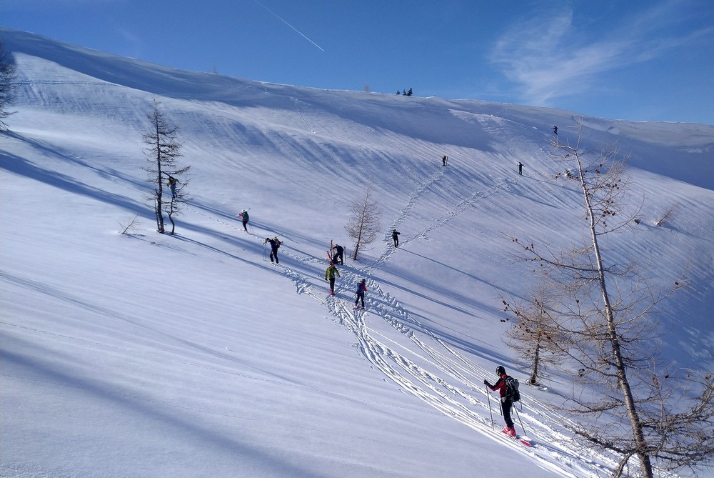 Po Hochwabstrasse (silnice B24) dojedeme k mostu při ústí potoka Bärenbach do Salzy (632 m). Po zaparkování auta nastupujeme podle stavu sněhu rovnou na skialpy nebo nás čeká zpočátku pěší pochod půldruhého kilometru po prohrnuté cestě. Od druhého mostu stoupáme na skialpech lesní cestou údolím nad údolím potoka Bärenbach. Cesta stoupá s různým sklonem a mnoha serpentinami. Při výstupu si můžeme některé serpentiny zkrátit strmějším terénem a zároveň tak otestovat stav sněhu pro následný sjezd. Kolem skalního masivu Eckstein docházíme až k lovecké chatě (1296 m) v sedle Bärnbachsattel.