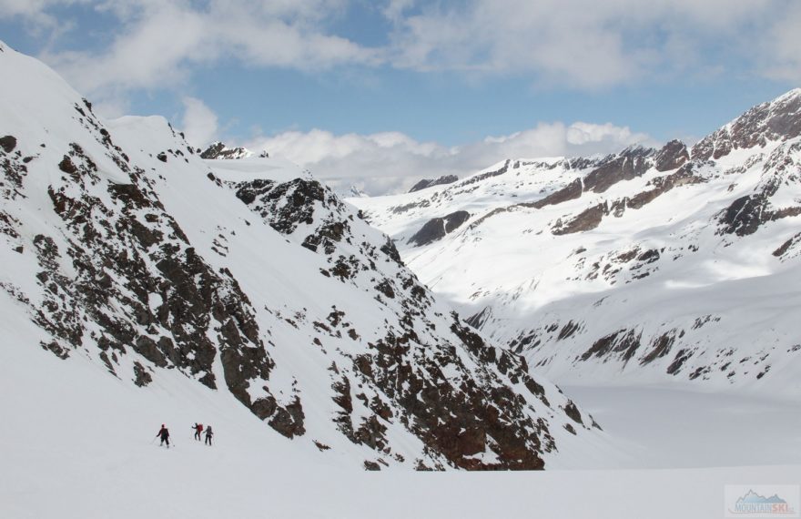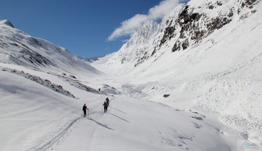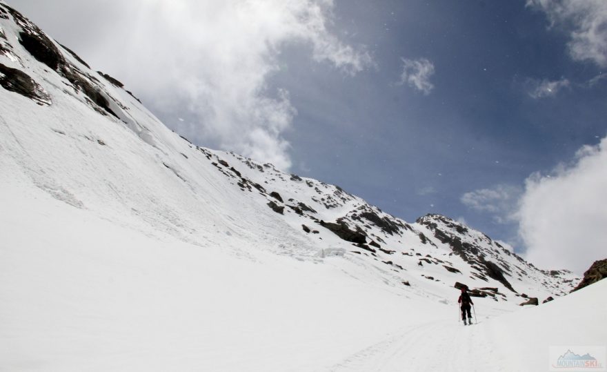 Jedeme po pravé straně potoka a obvykle se nevyhneme bruslení nebo alespoň odrážení holemi. Tento úsek je pro splitboardisty velmi nepříjemný. K hraně svahu nad chatou Langtalereckhütte můžou ti, co se jim podaří rozjet, dostat krátkým šlapáním bokem. Ostatní asi zvolí nasazení tuleních pásů.