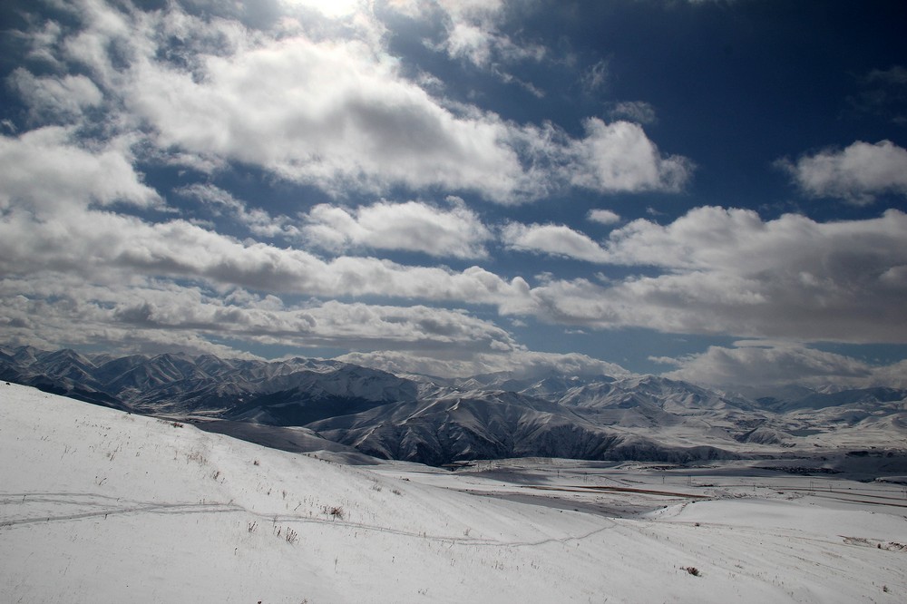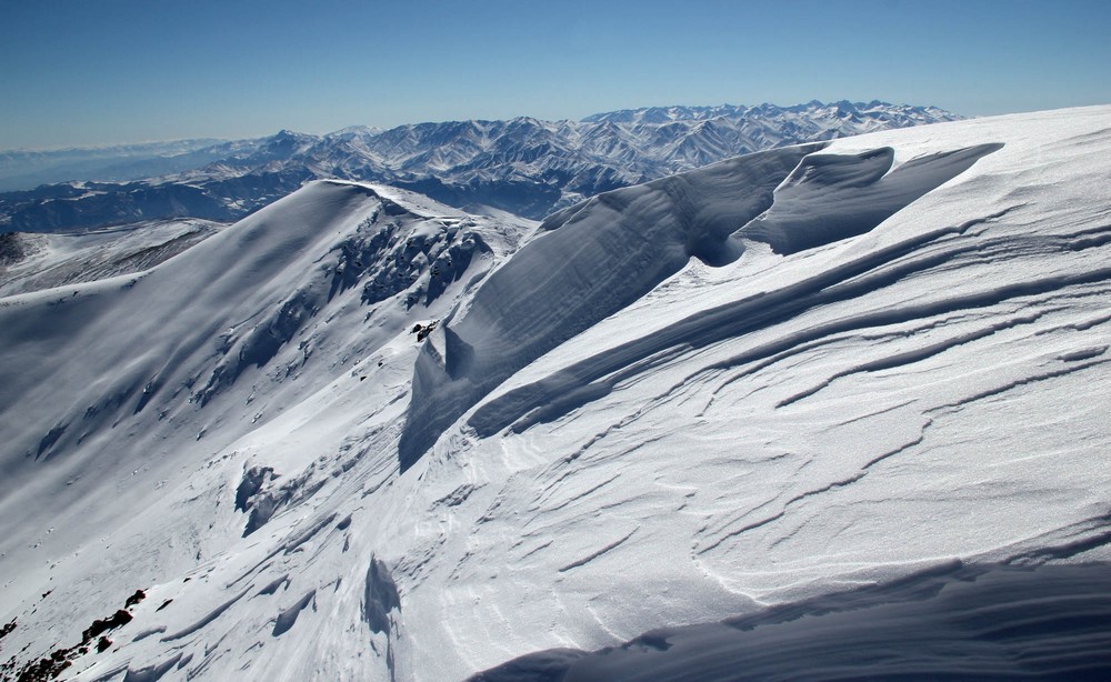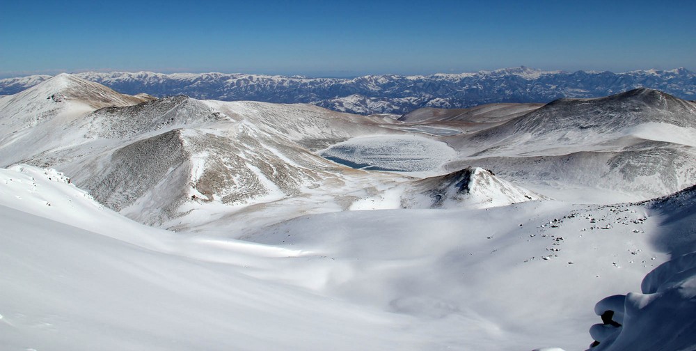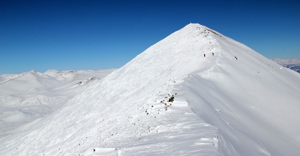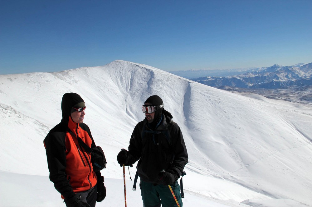 Mírným stoupáním se začneme přibližovat ke strmějším svahům Iskhkanasaru. Za bezejmenným “krtincem” 2650 metrů dáváme krátkou pauzu a stoupáme strměji na hlavním hřeben do výšky 3130 metrů. Odtud se otevírá výhled na severní svahy, které jsou v údolí úplně vyfoukané na kamenolom, ale výše se na místech chráněných před působením silného větru drží velká vrstva sněhu.