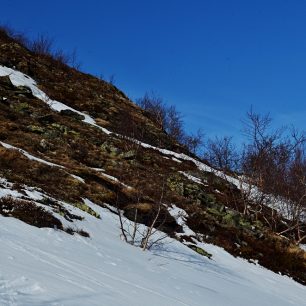 11:00 – zkrat. Zcela mimo své rozumné já jdu balit batůžek a lepím pásy. 11:26 vyrážím. Lyže mám připevněné na batohu. Spodní část je nejstrmější a jarní sluníčko taky udělalo své, sněhu ubývá.