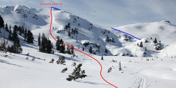parkoviště v lyžařském středisku (1590 m) – výstup po červené turistické značce napříč upravovaným běžkařským okruhem k jihu – pláň u plesa Kathüttensee – za plesem výstup do sedla Goldbachscharte (1950 m) – západním hřebenem na vrchol Jochspitze (2037 m) – sjezd podle sněhových podmínek z vrcholu přímo na sever nebo po výstupové trase